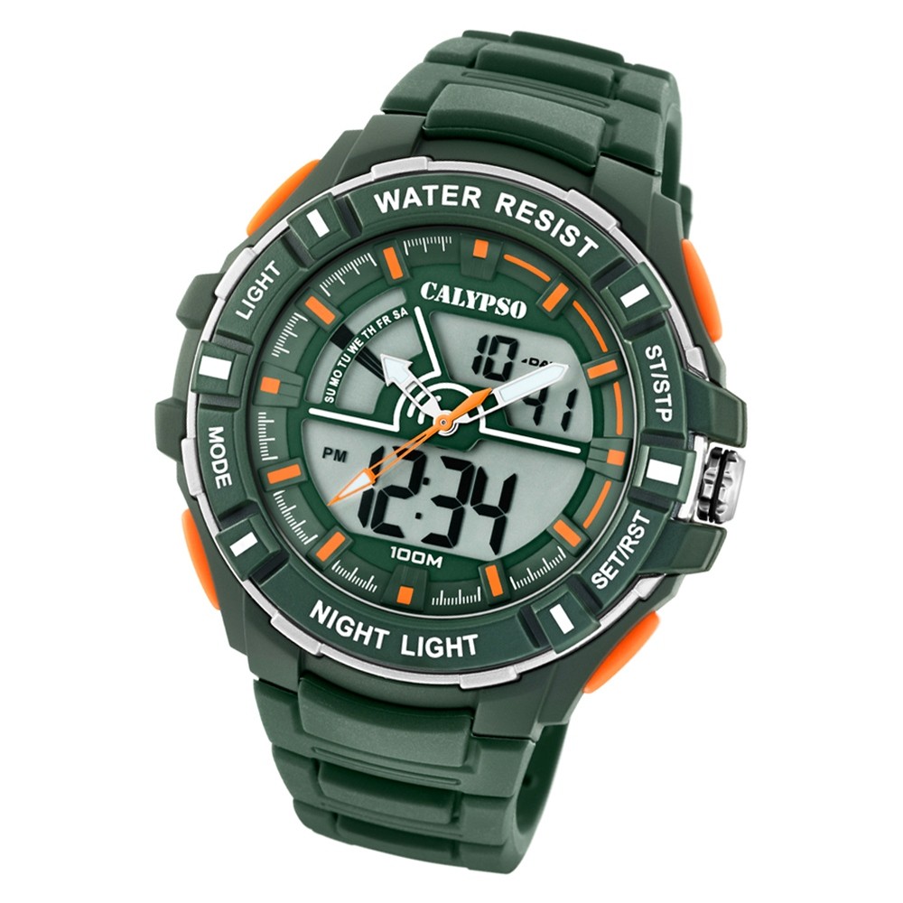 Modisch, sportlich und immer up to date - so zeigt sich auch diese stylische Uhr von Calypso. Die Sport-Uhr K5769/5 für Herren verfügt über ein präzises Quarzwerk und ist bis 10 bar wasserdicht. Das hochwertige PU-Armband in grün garantiert einen hohen Tragekomfort zu einem unschlagbar günstigen Preis.- besondere Eigenschaften