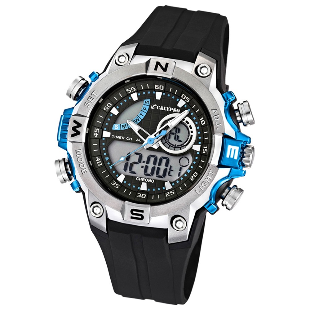 Sportlich Calypso Herrenuhr mit analoger und digitaler Anzeige. Dieser Funktionsuhr für Herren wurde aus qualitativ hochwertigen, absolut hautverträglichen Materialien gefertigt und mit blauen Highlights versehen.