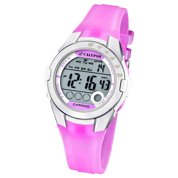 Wunderschöne Calypso Uhr mit digitaler Anzeige für Mädchen in der Farbe flieder. Diese JugendUhr wurde aus qualitativ hochwertigen, absolut hautverträglichen Materialien gefertigt. Auf der polierten Lünette befinden sich gravierte Herzen.