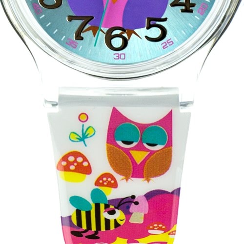 Damen Armbanduhr - Eule Waldtiere - mit mehrfarbigen Kunststoffarmband und hellblauem Ziffernblatt aus der Chic-Watches Lady Uhrenkollektion.