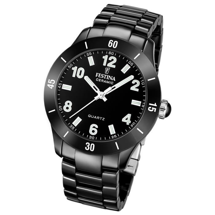 Diese einzigartige Uhr für Damen aus der aktuellen Keramik Kollektion garantiert hohen Tragekomfort durch das hochwertige Keramik-Armband in schwarz. Die Armbanduhr mit analoger Anzeige und präzisem Armbanduhr ist ein zuverlässiger Begleiter in Alltag und Freizeit.Die Festina ?Keramik? Kollektion besticht durch ihre kosmopolitische Ausstrahlung. Aus hochwertiger, kratzfester High-Tech-Keramik gefertigt, bieten sie eine einzigartige Kombination aus Design und außergewöhnlicher Langlebigkeit.