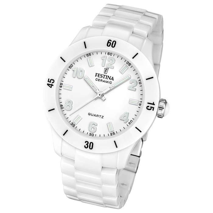 Diese einzigartige Uhr für Damen aus der aktuellen Keramik Kollektion garantiert hohen Tragekomfort durch das hochwertige Keramik-Armband in weiß. Die Armbanduhr mit analoger Anzeige und präzisem Armbanduhr ist ein zuverlässiger Begleiter in Alltag und Freizeit.Die Festina ?Keramik? Kollektion besticht durch ihre kosmopolitische Ausstrahlung. Aus hochwertiger, kratzfester High-Tech-Keramik gefertigt, bieten sie eine einzigartige Kombination aus Design und außergewöhnlicher Langlebigkeit.