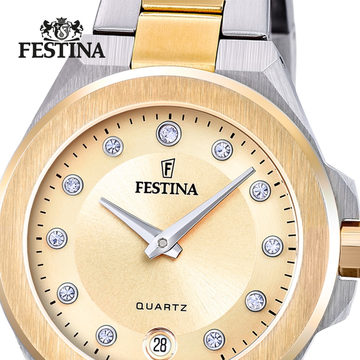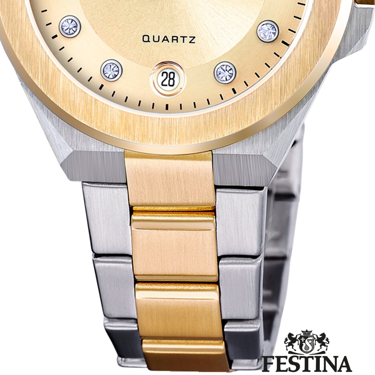 Diese einzigartige Uhr für Damen aus der aktuellen Festina Mademoiselle Kollektion garantiert hohen Tragekomfort durch das hochwertige Edelstahl-Armband in silber und gold. Die Armbanduhr mit analoger Anzeige ist ein zuverlässiger Begleiter in Alltag und Freizeit.Die FESTINA Mademoiselle Kollektion vereint Glamour und Weiblichkeit. In jedem Design steckt eine Note Eleganz und ein funkelnder Swarovski-Kristall. Dies führt zum zarten und vornehmen Aussehen dieser Uhren.