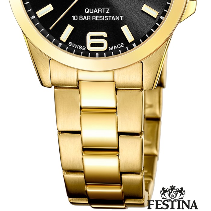 Diese einzigartige Uhr für Damen aus der aktuellen Festina Swiss Made Kollektion garantiert hohen Tragekomfort durch das hochwertige Edelstahl-Armband in gold. Die Armbanduhr mit analoger Anzeige ist ein zuverlässiger Begleiter in Alltag und Freizeit.- besondere Eigenschaften