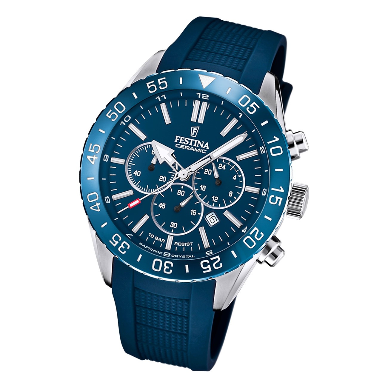 Diese elegante Uhr für Herren aus der exklusiven Festina Keramik-Kollektion verfügt über ein hochwertiges Silikon-Armband in blau. Das analoge Quarzwerk und die Wasserdichte bis 10 bar machen diese Armbanduhr zu einem besonders zuverlässigen Begleiter.- Besonderheiten: