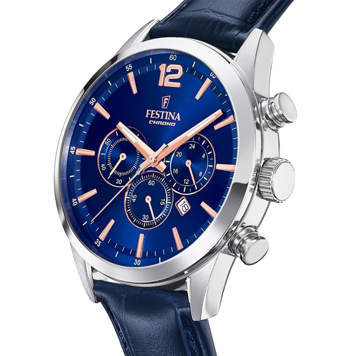 Diese Fashion Uhr für Herren aus der exklusiven Festina Timeless Chronograph-Kollektion verfügt über ein hochwertiges Leder-Armband in dunkelblau. Das ausgezeichnete Uhrwerk und die Wasserdichte bis 5 bar machen diese Armbanduhr zu einem besonders zuverlässigen Begleiter.- Besonderheiten: