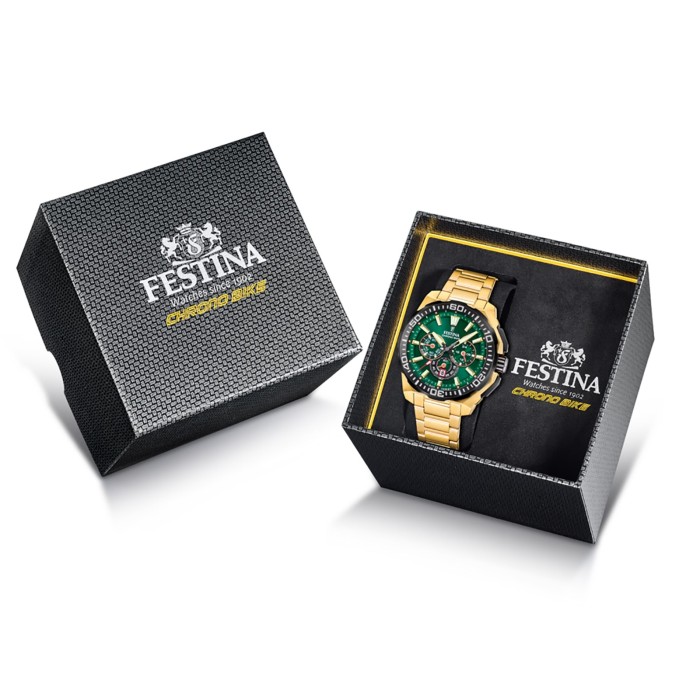 Die ?Chrono Bike? Kollektion von Festina sind sportliche Uhren, die vom Radsport inspiriert sind. Sie haben ein robustes Gehäuse, ein leuchtendes Zifferblatt, ein präzises Quarzwerk und ein sportliches Armband.