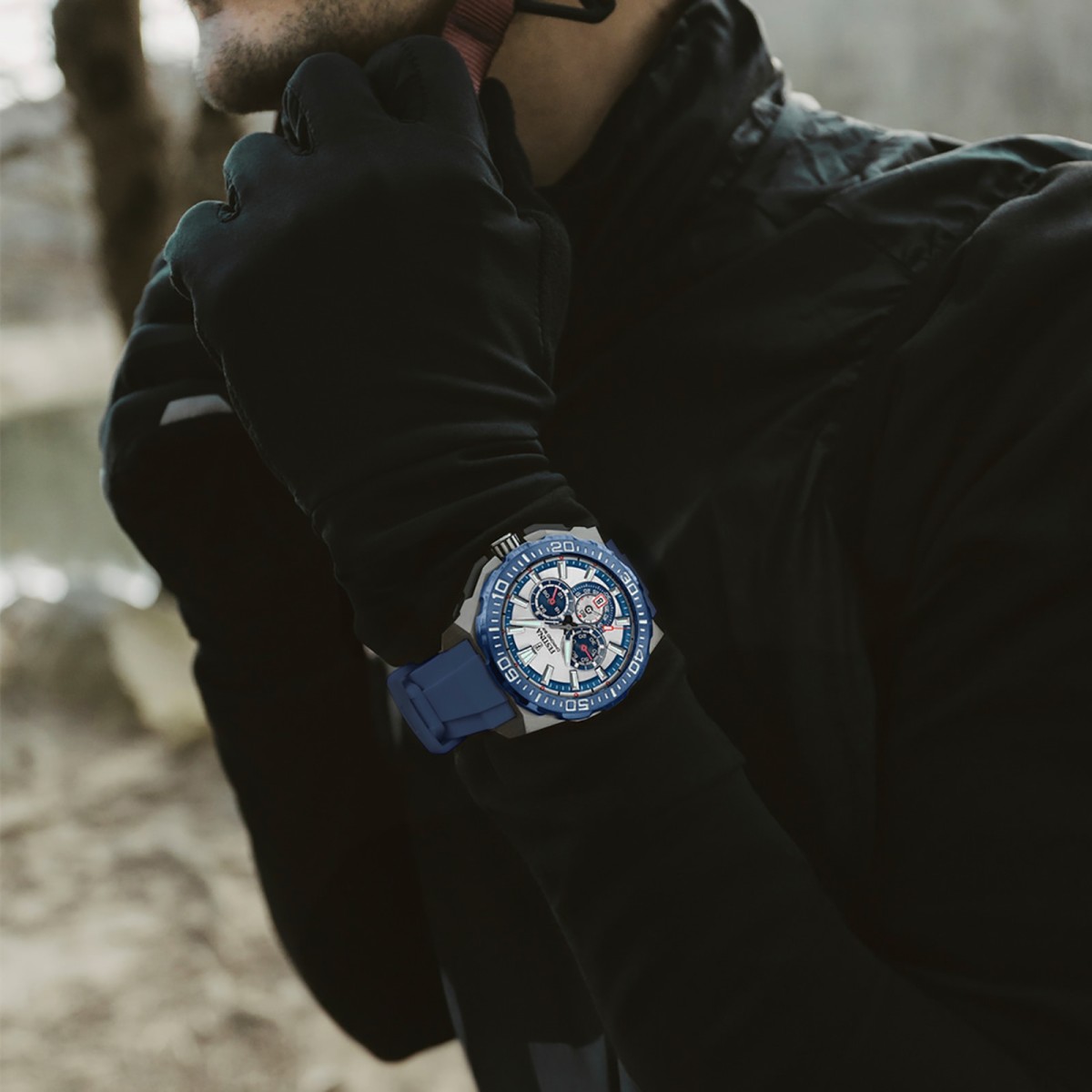 Diese einzigartige Uhr für Herren aus der aktuellen Chrono Bike Kollektion garantiert hohen Tragekomfort durch das hochwertige Kautschuk-Armband in blau. Der Chronograph und präzisem Armbanduhr ist ein zuverlässiger Begleiter in Alltag und Freizeit.- besondere Eigenschaften