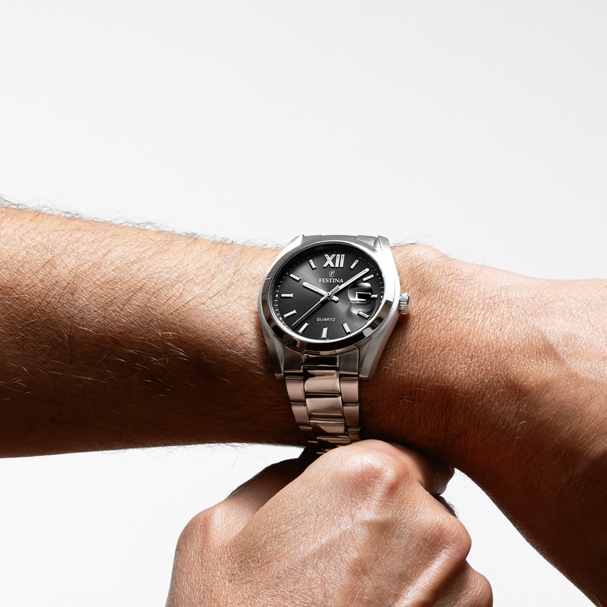 Diese einzigartige Uhr für Herren aus der aktuellen Klassik Kollektion garantiert hohen Tragekomfort durch das hochwertige Edelstahl-Armband in silber. Die Armbanduhr mit analoger Anzeige und präzisem Armbanduhr ist ein zuverlässiger Begleiter in Alltag und Freizeit.Die Festina ?Klassik? Uhrenkollektion bietet zeitlos elegante Uhren für Damen und Herren. Sie zeichnen sich durch schlichtes Design, gute Lesbarkeit und eine raffinierte Ästhetik aus.