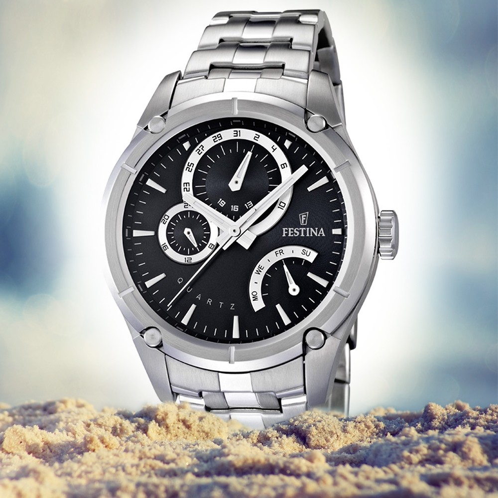 Festina Multifunktionsuhr für Herren aus der Sport Collection mit schwarzem Ziffernblatt und Edelstahlarmband.