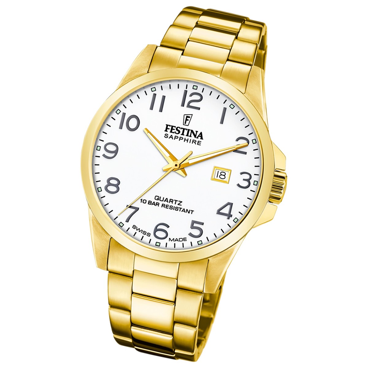 Diese einzigartige Uhr für Herren aus der aktuellen Swiss Made Kollektion garantiert hohen Tragekomfort durch das hochwertige Edelstahl-Armband in gold . Die Armbanduhr mit analoger Anzeige und präzisem Armbanduhr ist ein zuverlässiger Begleiter in Alltag und Freizeit.Die Kollektion ?Swiss Made? von Festina sind exklusive Schweizer Uhren, die für Liebhaber von Präzision und Stil entworfen wurden. Die Uhren haben ein klassisches Design mit drei Zeigern und sind für Damen und Herren erhältlich.