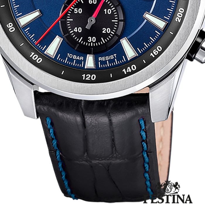 Diese einzigartige Uhr für Herren aus der aktuellen Festina Timeless Chronograph Kollektion garantiert hohen Tragekomfort durch das hochwertige Leder-Armband in schwarz und blau. Der Chronograph ist ein zuverlässiger Begleiter in Alltag und Freizeit.- besondere Eigenschaften