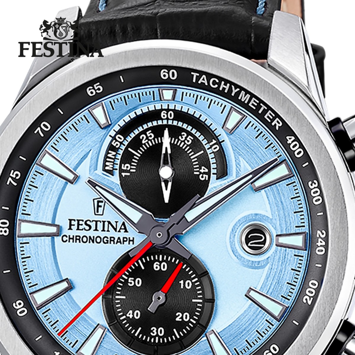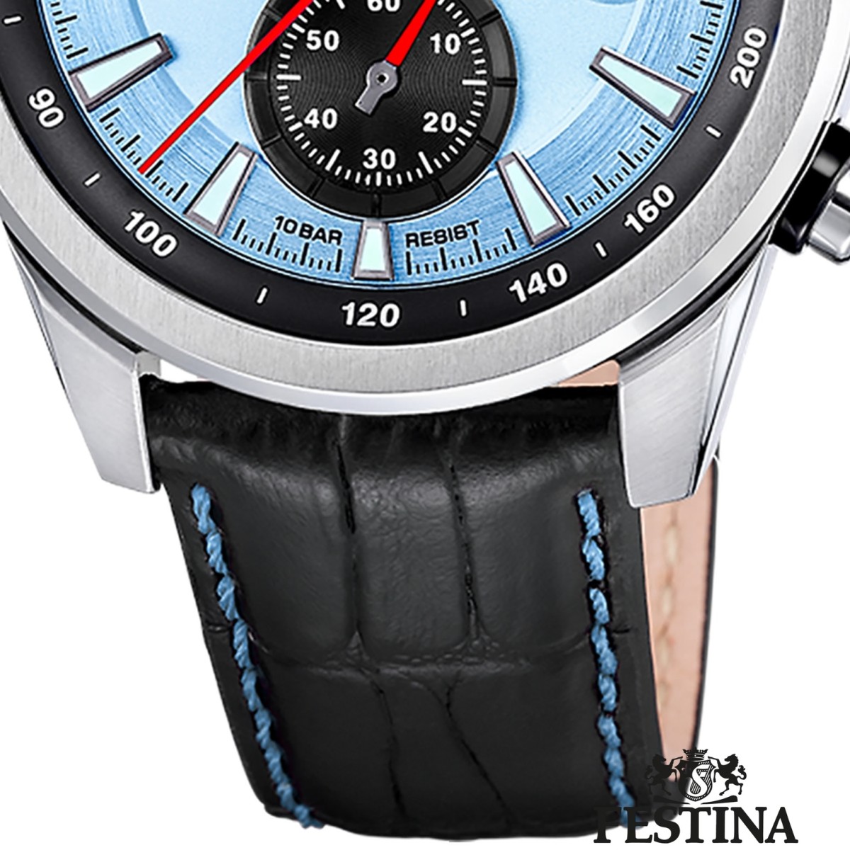 Diese einzigartige Uhr für Herren aus der aktuellen Festina Timeless Chronograph Kollektion garantiert hohen Tragekomfort durch das hochwertige Leder-Armband in schwarz und hellblau. Der Chronograph ist ein zuverlässiger Begleiter in Alltag und Freizeit.- besondere Eigenschaften