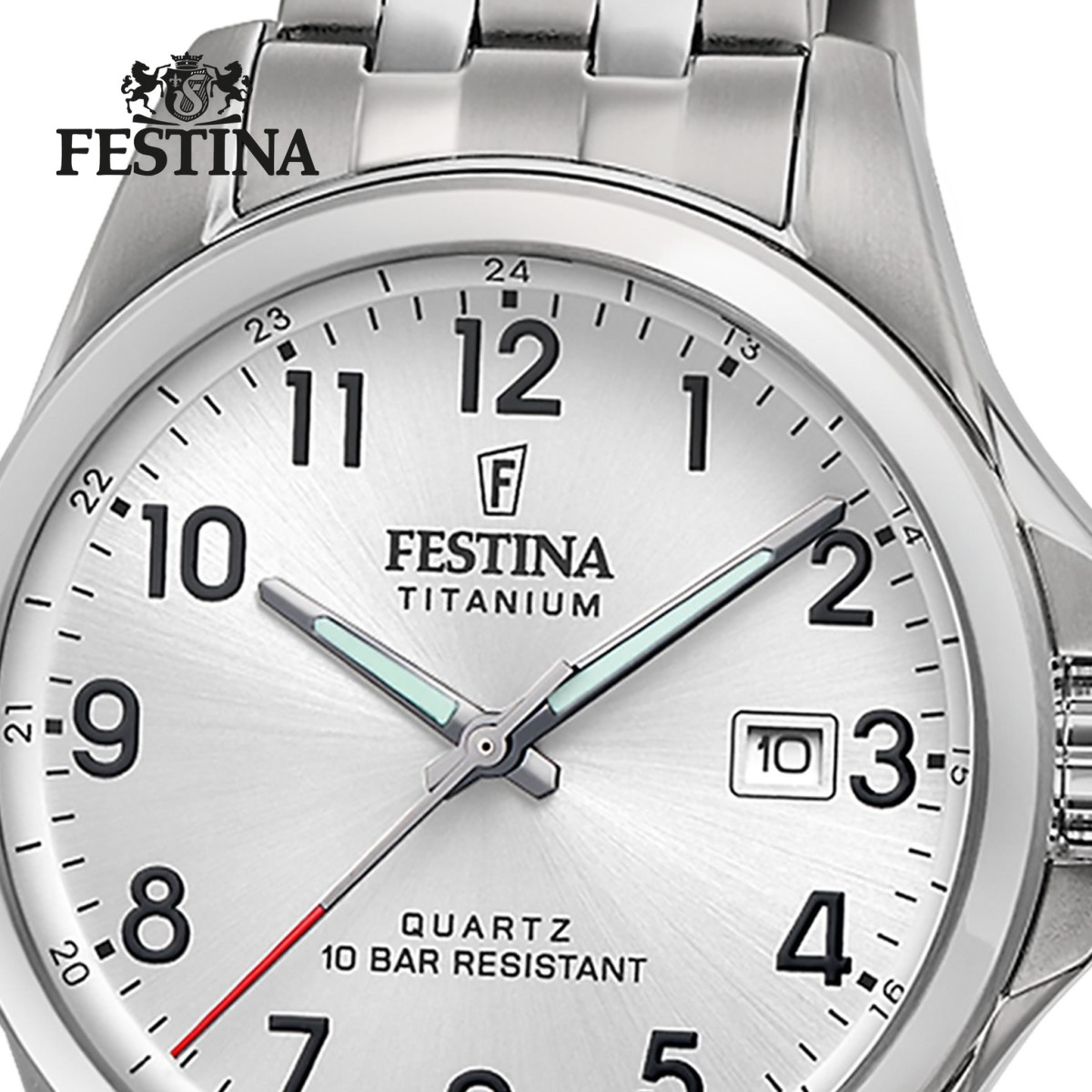 Diese einzigartige Uhr für Herren aus der aktuellen Festina Titanium Kollektion garantiert hohen Tragekomfort durch das hochwertige Titan-Armband in silber. Die Armbanduhr mit analoger Anzeige ist ein zuverlässiger Begleiter in Alltag und Freizeit.Die FESTINA Titanium Kollektion umfasst elegante und funktionale Zeitmesser für Damen und Herren. Durch die Verwendung von hochwertigem Titan ist sie extrem leicht, robust, korrosionsbeständig und zudem hypoallergen.
