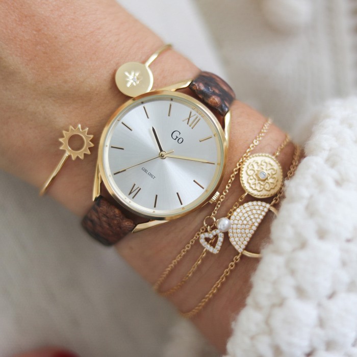 Eine schöne Girl Only GO Uhr für Damen ausgestattet mit einem Quarzwerk und einem Edelstahl-Gehäuse in der Farbe gold. Die Casual Uhr der Marke Girl Only hat ein hochwertiges Lederarmband in braun mit Dornschließe. Die Analoguhr hat ein Zifferblatt in der Farbe silber. Die Form der Uhr ist rund und das Gehäuse ist mittel ca. 32mm.- besondere Eigenschaften