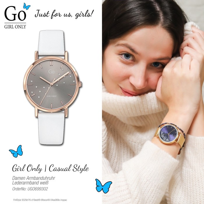 Der Schmetterling, der die Marke Girl Only symbolisiert, verkörpert das Ziel der Uhrenfirma: harmonisch und schön. Feminine und erschwingliche Uhren speziell für junge Damen, die sowohl als Modeaccessoires als auch als Zeitmesser konzipiert sind, aber auch einen unverwechselbaren Charme und Originalität haben.