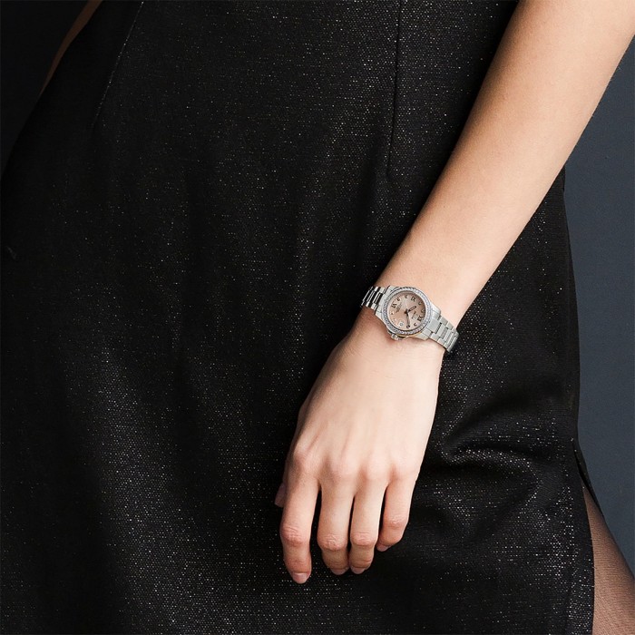 - Zirkonia-Steine auf Lünette und Zifferblatt