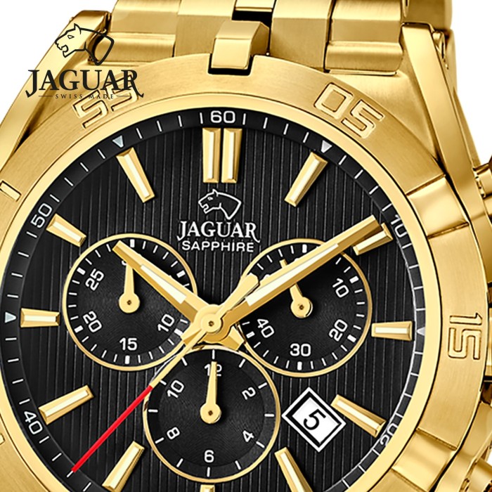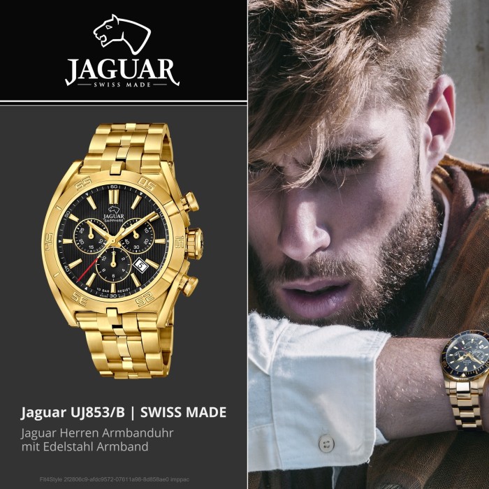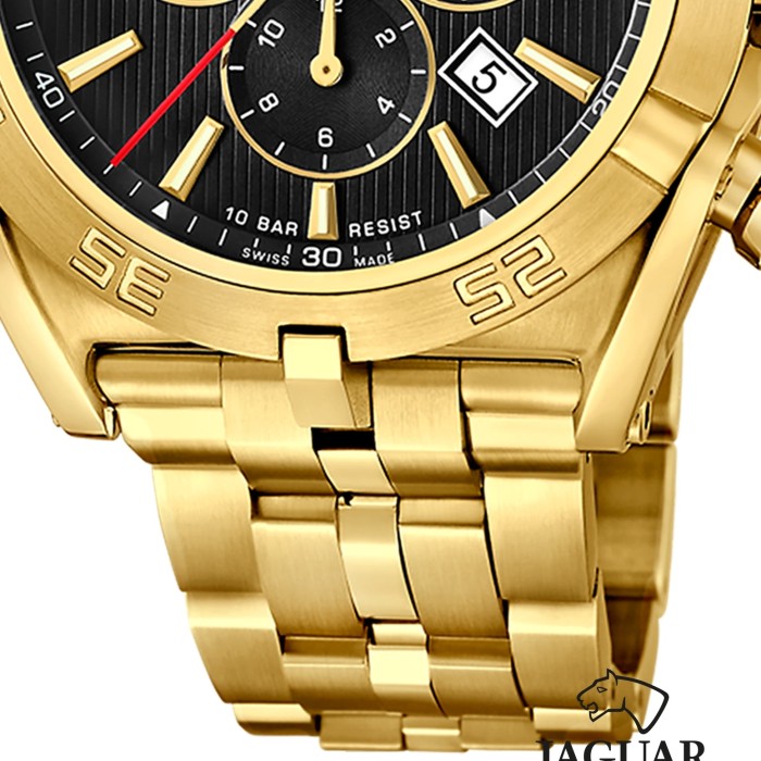 Diese einzigartige Uhr für Herren aus der aktuellen Jaguar Executive Kollektion garantiert hohen Tragekomfort durch das hochwertige Edelstahl-Armband in gold. Der Chronograph und präzisem Armbanduhr ist ein zuverlässiger Begleiter in Alltag und Freizeit.- besondere Eigenschaften