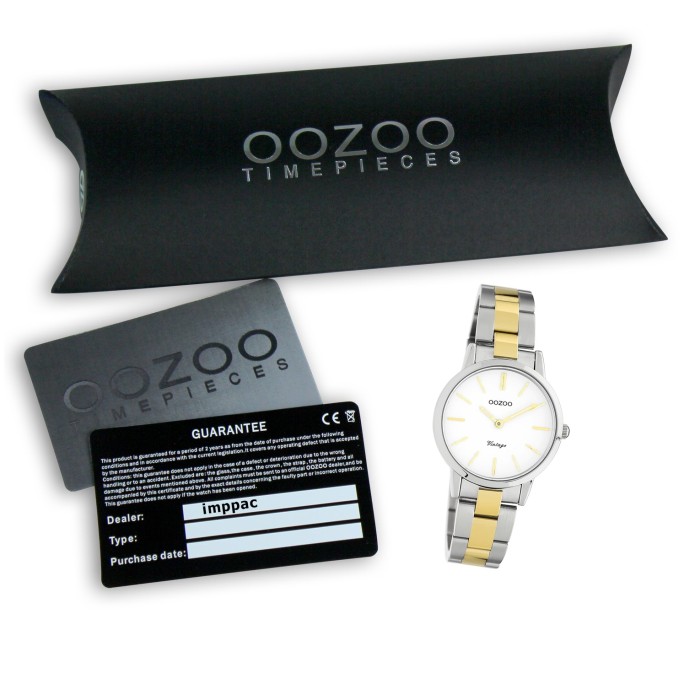 Diese Fashion Uhr für Damen aus der exklusiven Oozoo Vintage Series-Kollektion verfügt über ein hochwertiges Edelstahl-Armband in silber und gold. Das analoge Quarzwerk und die Wasserdichte bis 3 bar machen diese Armbanduhr zu einem besonders zuverlässigen Begleiter.- besondere Eigenschaften