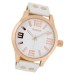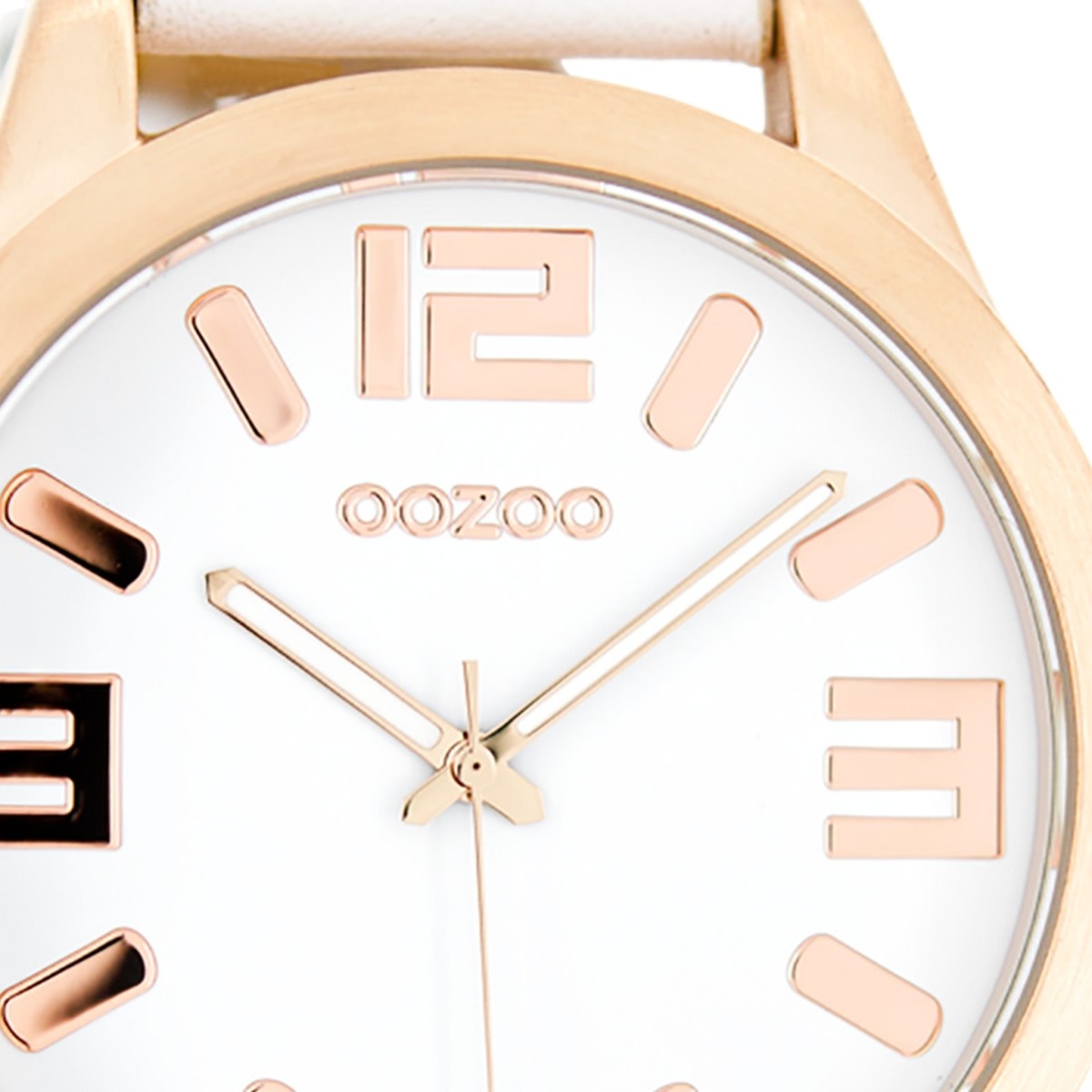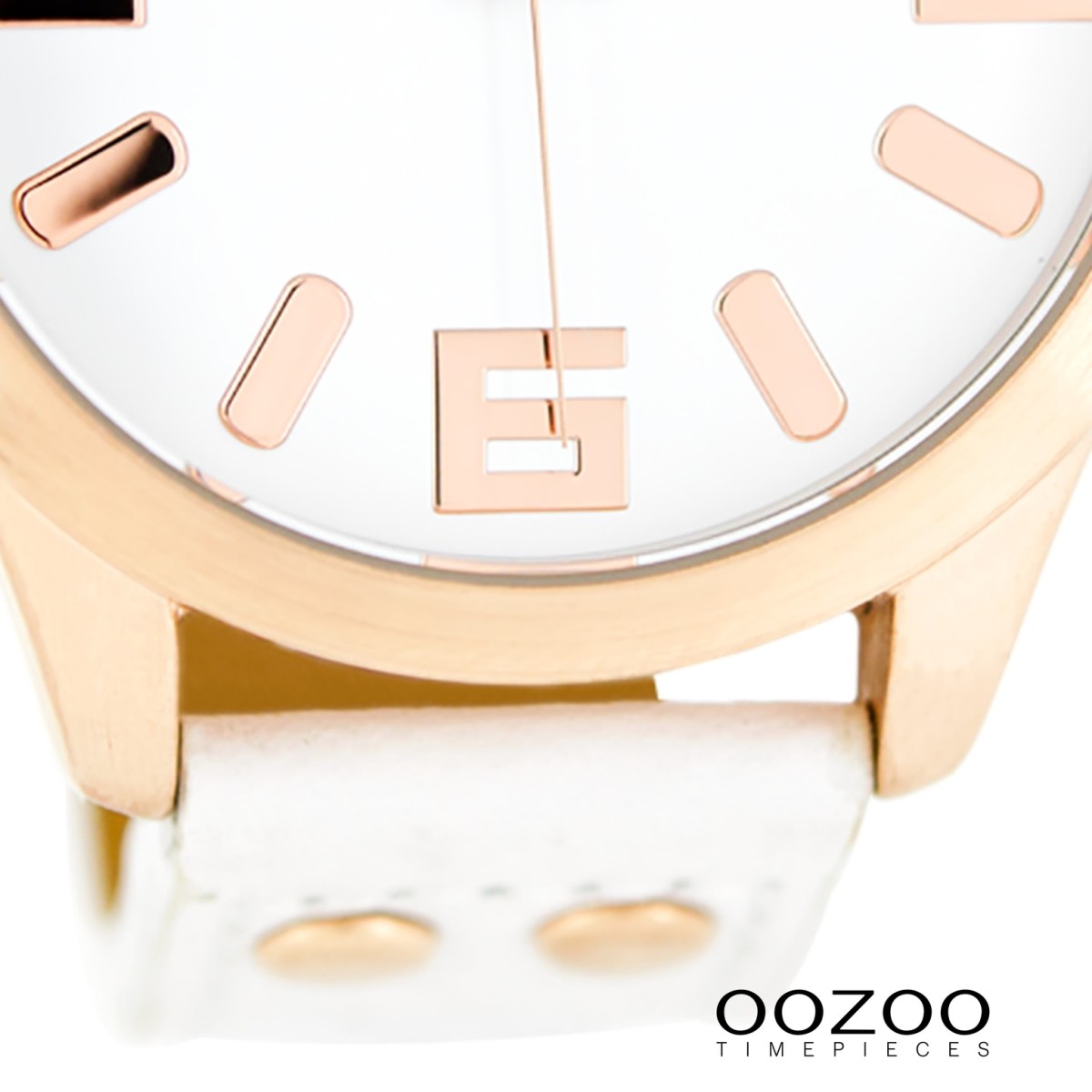 OOZOO Damen Uhr XXL - Armbanduhr mit weißem Ziffernblatt und rosegoldenem Gehäuse und Ziffern aus der Oozoo Timepieces Kollektion. Das Armband ist aus weißem Leder.