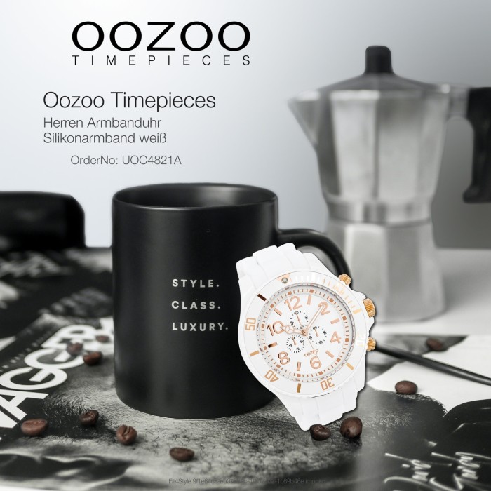 Diese Fashion Uhr für Herren aus der exklusiven Oozoo Oozoo Timepieces-Kollektion verfügt über ein hochwertiges Silikon-Armband in weiß. Das Gehäuse der Uhr ist extra groß (ca. 48mm). Das analoge Uhrwerk und das Uhrenglas aus Mineralglas machen diese Armbanduhr zu einem hochwertigen und modischen Begleiter.- besondere Eigenschaften