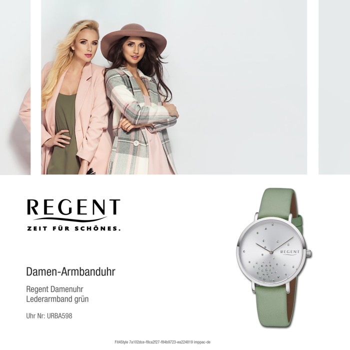 Diese Fashion Uhr für Damen aus der exklusiven Regent Blütezeit-Kollektion verfügt über ein hochwertiges Leder-Armband in grün. Das analoge Quarzwerk und die Wasserdichte bis 3 bar machen diese Armbanduhr zu einem besonders zuverlässigen Begleiter.- besondere Eigenschaften