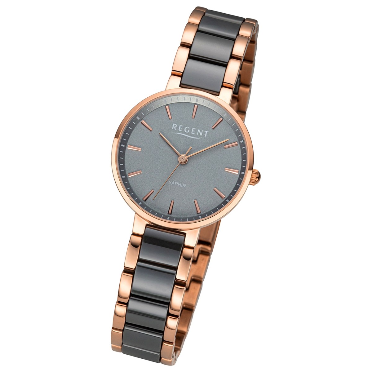 Diese Casuale Armbanduhr für Damen ist aus der exklusiven Regent Metallarmband-Kollektion. Sie hat ein hochwertiges Keramik-Armband in rosegold und schwarz. Das Gehäuse der Uhr ist extra groß (ca. 30mm). Das analoge Uhrwerk und das Uhrenglas aus Saphirglas machen diese Armbanduhr zu einem hochwertigen und modischen Begleiter.- besondere Eigenschaften