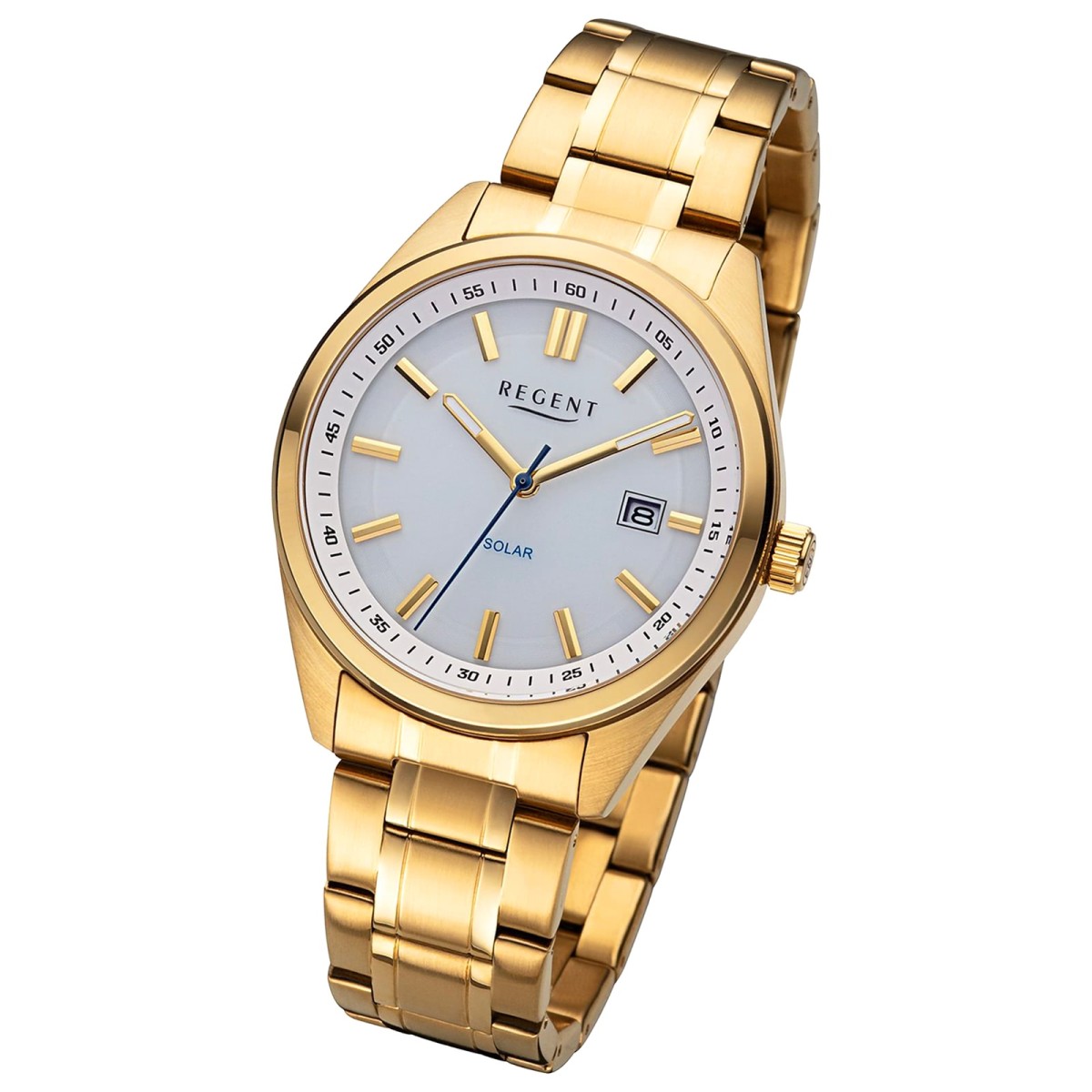 Diese Fashione Solaruhr für Herren ist aus der exklusiven Regent Metallarmband-Kollektion. Sie hat ein hochwertiges Metall-Armband in gold. Das Gehäuse der Uhr ist extra groß (ca. 40mm). Das analoge Uhrwerk und das Uhrenglas aus Mineralglas machen diese Solaruhr zu einem hochwertigen und modischen Begleiter.- besondere Eigenschaften
